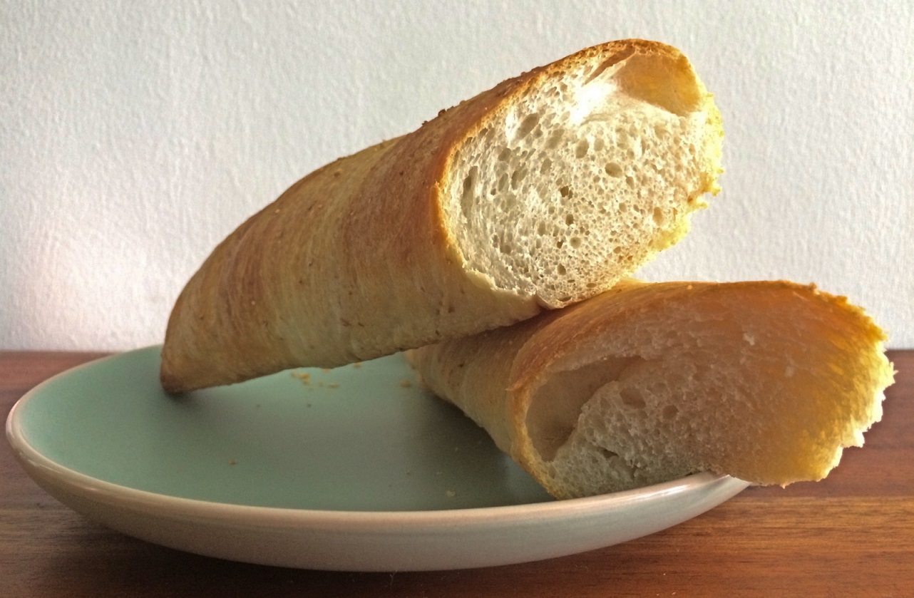 Baguettes are so flexible and quite plain. You can eat one with just about anything. I like having one with sunny-side up egg cooked in a small amount of butter with Parmesan cheese sprinkled on top. That’s breakfast.