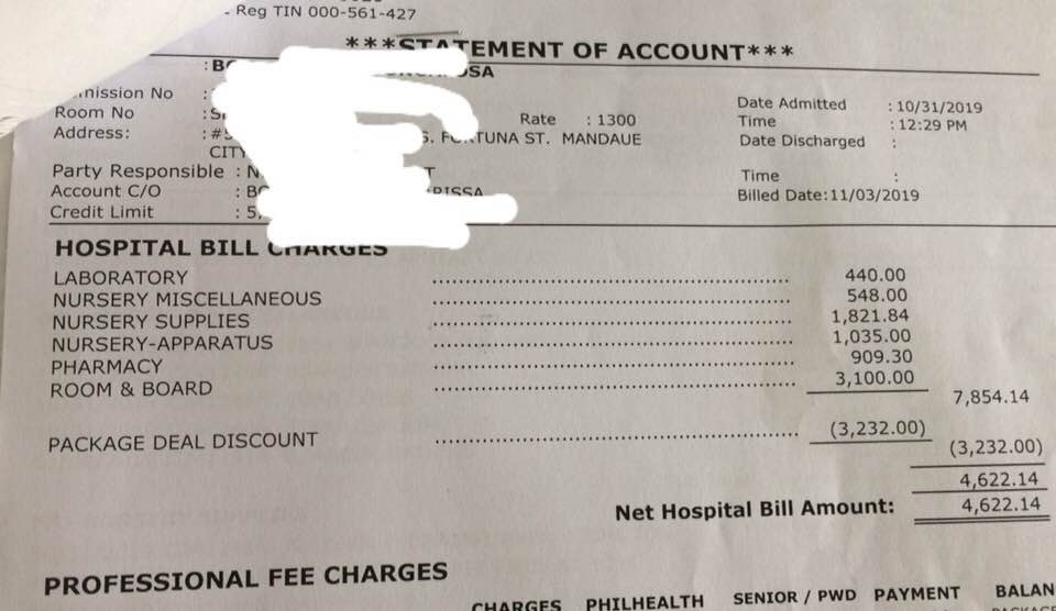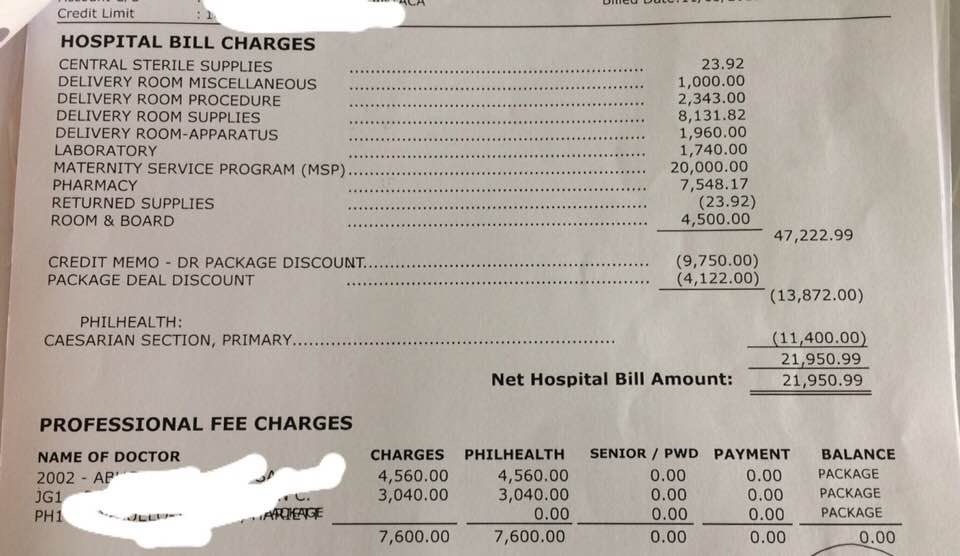 For Caesarian birth, Philhealth covers P19,000 of your total hospital bill. As shown below, they deducted P11,400 on my total hospital bill charges and P7,600 on professional fee charges. Please see the final amount I paid below: